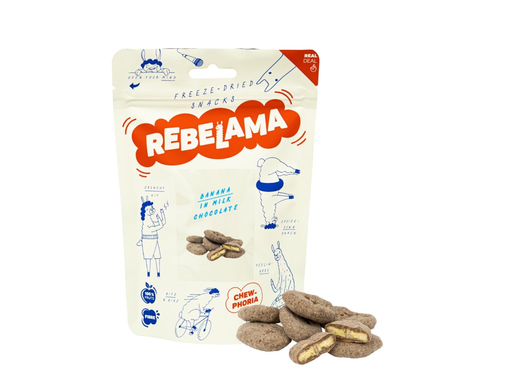Zloženie: Mliečna čokoláda 75% (cukor, kakaové maslo,sušené plnotučné mlieko, kakaová hmota,sušené odtučnené mlieko, vanilka emulgátory: repkový lecitín, 25% Lyofilizované banány. Môže obsahovať sóju a orechy.