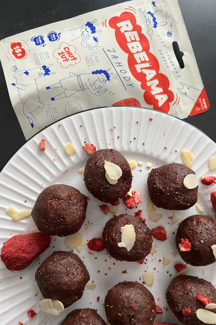 Tip: Guličky môžete obaliť v lyofilizovaných jahodách rozmixovaných na prach, v kokose alebo v kakau pre ešte krajší vzhľad. Vďaka lyofilizovanému ovociu získate intenzívnu chuť ovocia v každom súste.